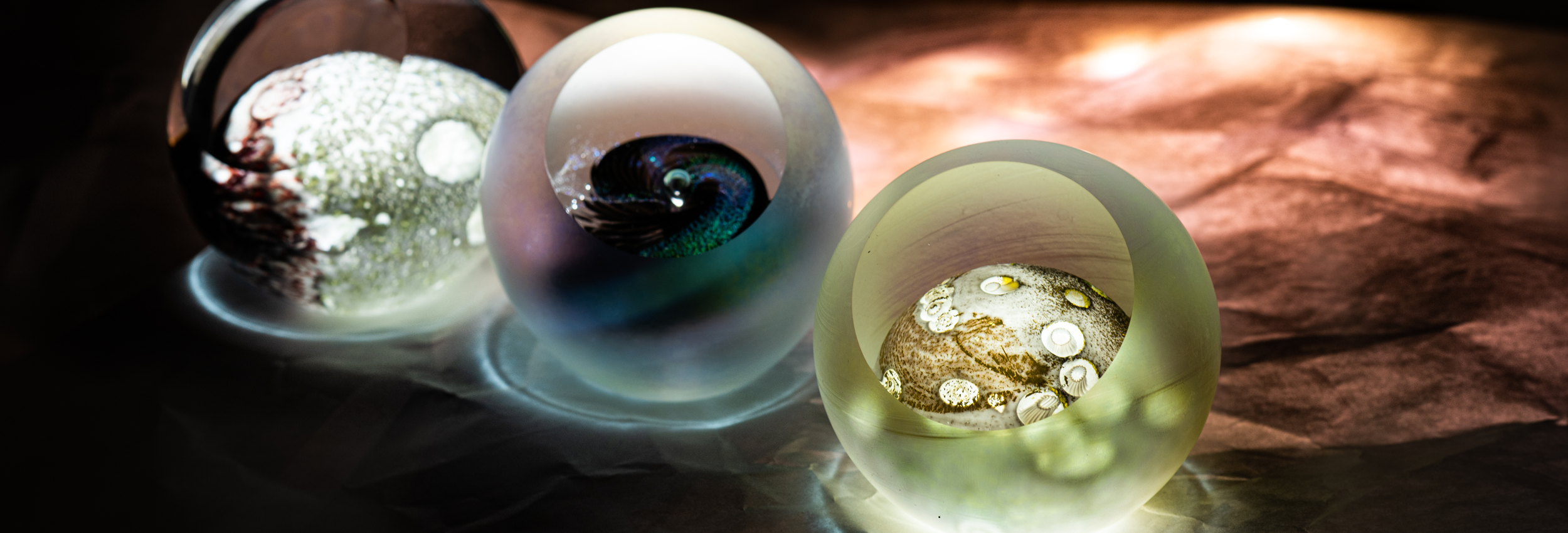Inspired by the designer’s interpretation of the solar system, each weight takes a team of 2-3 artists to create. These carefully formed designs use a wide spectrum of specialty colors, dichroic glass, glow material, and precious metals.